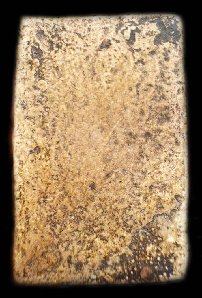 ด้านหลังแบบนี้เรียกหลังสังขยา ดูเหมือนเรียบ แต่ไม่เรียบ เห็นหลุมบ่อสูงต่ำ เล็กใหญ่  ไม่เป็นระเบียบ รอยกระเทาะ ผิวพระเป็นชั้นๆ เป็นคุณสมบัติของปูนเปลือกหอย ก้อนดำเม็ดแดง ครบ