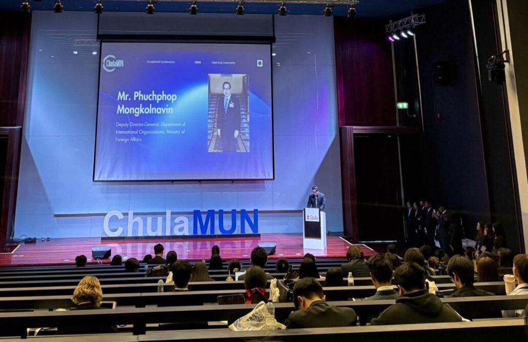 On 3 April 2026, Mr. Phuchphop Mongkolnavin, Deputy Director-General of the Department of International Organizations, delivered the opening remarks at the Annual Chulalongkorn Model United Nations Conference 2026, under the theme “Braving the Waves: Navigating the Changing Dynamics of the New World Order” at Chulalongkorn University. Also in attendance was Mr. Pisanu Suvanajata, Vice Chairman of C asean, Ms. Marisa Panyachiva, Representative of the United Nations Resident Coordinator’s Office, and Associate Professor Dr. Sukanya Sompiboon, Vice-President of Chulalongkorn University.