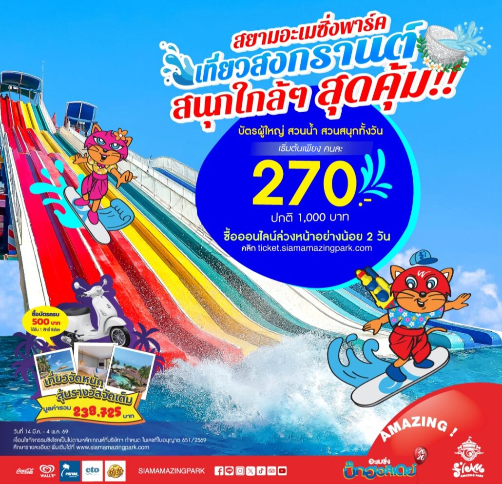 สงกรานต์ทั้งที ไม่เที่ยวได้งัย เลือกเที่ยวแบบไม่ต้องกังวลค่าใช้จ่าย ราคาสบายกระเป๋า สนุกกับเครื่องเล่นสวนสนุกไม่อั้น ชุ่มฉ่ำในสวนน้ำแบบคุ้มสุดๆ ซื้อบัตรครั้งเดียวเที่ยวได้ทั้งวันในเทศกาล Amazing Big Holiday 2026 ที่สยามอะเมซิ่งพาร์ค
