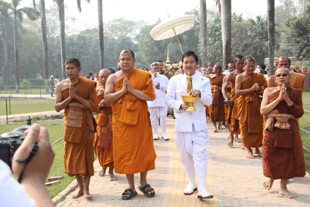 เวลา 07.30 น. คณะพระธรรมทูต แขกผู้มีเกียรติ และพุทธศาสนิกชน พร้อมใจกันตั้งริ้วขบวน ณ บริเวณสาลวโนทยาน ก่อนอัญเชิญพระพุทธรูปปางปรินิพพานขึ้นประดิษฐานบนราชรถบุษบก เคลื่อนไปยังมกุฏพันธนเจดีย์อย่างสง่างาม